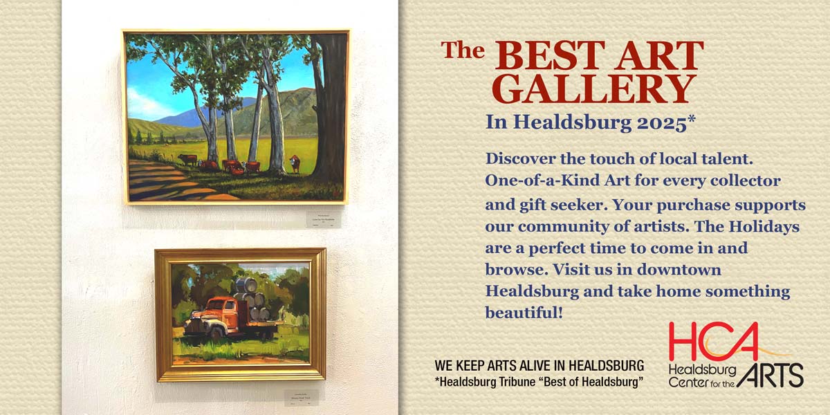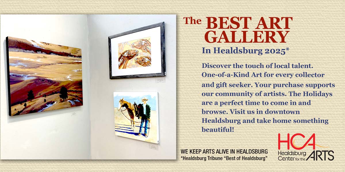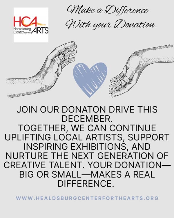 As we approach the end of the year, please consider making a donation to Healdsburg Center For The Arts. Your donation can make a meaningful difference! Help us support our local artists, strengthen our current exhibition schedule, and provide opportunities for young, emerging creators. Every contribution-big or small-helps keep art thriving in our community. Thank you for supporting the arts!