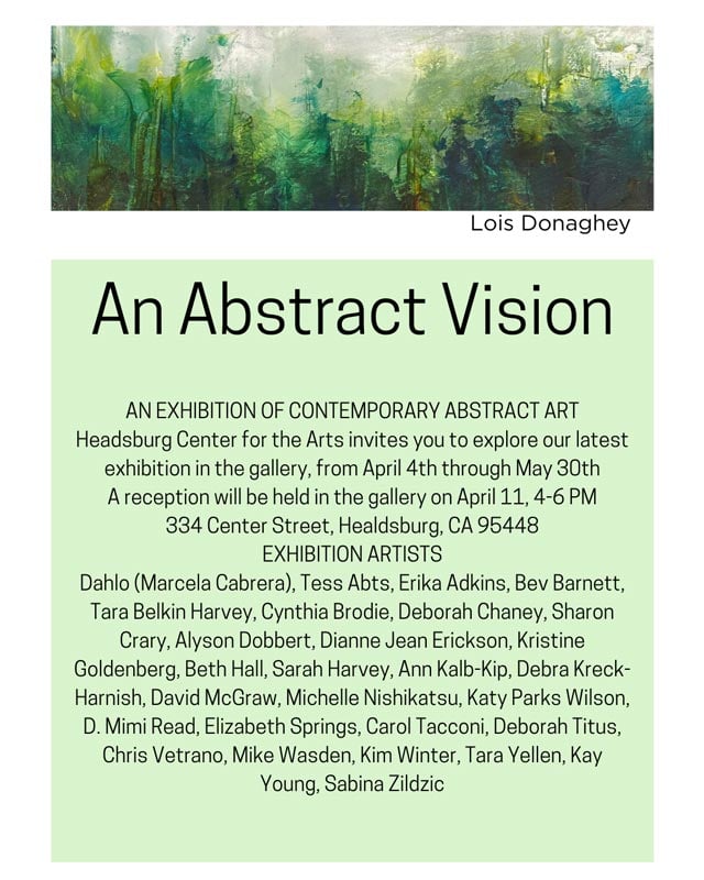 For the Love of artwatercolor classSlide2026Festival of the ArtsSeptember 26, 2026 10 am to 6 pm Become a Supporter Donate to the Center Shop at the Online Store Current & Upcoming ExhibitionFor the Love of ArtFebruary 11 - April 5, 2026A Heartfelt Celebration - works made with passon, curiosity and devotion.read more ...Call for SubmissionsSmall WondersJune 4 - July 19, 2026Some of the most exquisite beauty can be captured in the smallest of images and objectsread more ...Exhibition, UpcomingAn Abstract VisionApril 4 - May 30, 2026An Abstract Vision celebrates the work of artists creating abstract art.read more ...AnnouncementRenew your subscription for 2026Support HCA meaningfully with an annual subscription. Our new simplified terms feature lower fees and a calendar year term. Subscribe or Renew today!read more ...Call for Submissions2026 Healdsburg Arts FestivalSeptember 26, 2026 from 10 am to 6 pmA Healdsburg tradition: with over 30 participating artists, music, art workshops for children, a raffle, food, and good wine!read more ...EventArt Nite HealdsburgFirst Thursday of the monthFirst Thursdays 5-7 pm in Downtown Healdsburgread more ...AnnouncementBest Art Gallery 2025Thank you for voting us Best Art Gallery in Healdsburg 2025!read more ... News archive Classes and Workshops AdultIntermediate Watercolor Class with Phil McDonelSaturdays: Feb 21, Apr 18, May 16, Jun 20, Jul 18read more...AdultDrawing FundamentalsApril 7th-May 12th on Tuesdays read more... VIEW ALL CLASSES