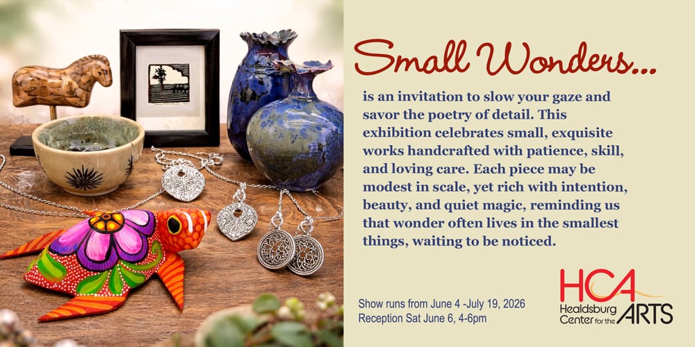 small wondersFor the Love of artwatercolor classSlide2026Festival of the ArtsSeptember 26, 2026 10 am to 6 pm Become a Supporter Donate to the Center Shop at the Online Store Current & Upcoming ExhibitionFor the Love of ArtFebruary 11 - April 5, 2026A Heartfelt Celebration - works made with passon, curiosity and devotion.read more ...Call for Submissions, Exhibition, UpcomingSmall WondersJune 4 - July 19, 2026Some of the most exquisite beauty can be captured in the smallest of images and objectsread more ...Exhibition, UpcomingAn Abstract VisionApril 4 - May 30, 2026An Abstract Vision celebrates the work of artists creating abstract art.read more ...AnnouncementRenew your subscription for 2026Support HCA meaningfully with an annual subscription. Our new simplified terms feature lower fees and a calendar year term. Subscribe or Renew today!read more ...Call for Submissions2026 Healdsburg Arts FestivalSeptember 26, 2026 from 10 am to 6 pmA Healdsburg tradition: with over 30 participating artists, music, art workshops for children, a raffle, food, and good wine!read more ...EventArt Nite HealdsburgFirst Thursday of the monthFirst Thursdays 5-7 pm in Downtown Healdsburgread more ...AnnouncementBest Art Gallery 2025Thank you for voting us Best Art Gallery in Healdsburg 2025!read more ... News archive Classes and Workshops AdultIntermediate Watercolor Class with Phil McDonelSaturdays: Feb 21, Apr 18, May 16, Jun 20, Jul 18read more...AdultDrawing FundamentalsApril 7th-May 12th on Tuesdays read more... VIEW ALL CLASSES
