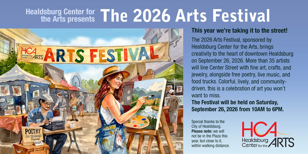 Call for Submissions2026 Healdsburg Arts FestivalSeptember 26, 2026 from 10 am to 6 pmA Healdsburg tradition: with over 30 participating artists, music, art workshops for children, a raffle, food, and good wine!read more ...