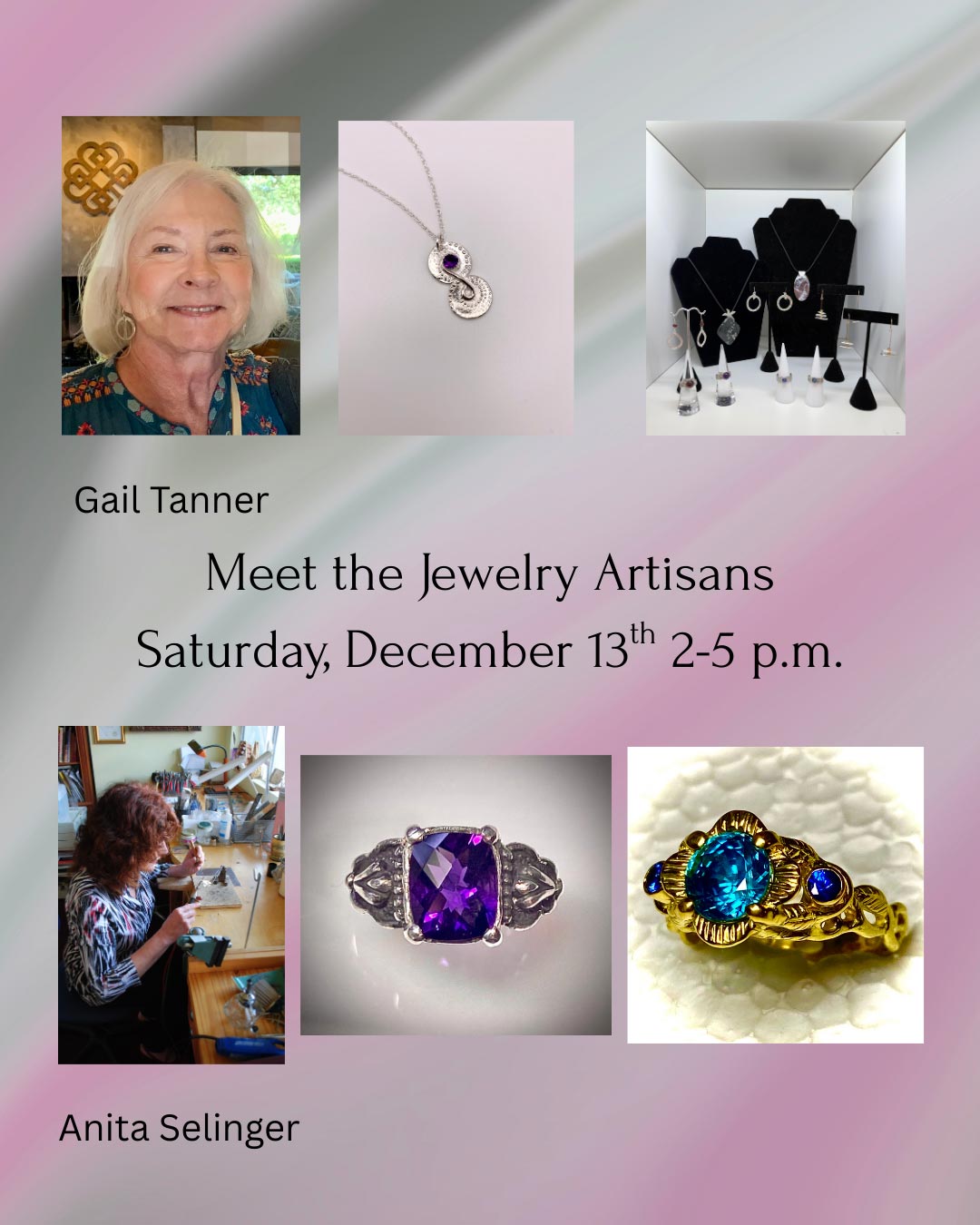 Anita Selinger, featuring silver and gold, and Gail Tanner, specializing in silver and mixed metals, will be on hand to talk to you about their craft and show you beautiful options for gift-giving in a range of prices.